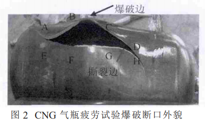 气瓶失效的主要形式是疲劳断裂,而疲劳断裂的大多数原因是由于在循环高压应力的工作环境中,气瓶的内部或外部发生细小的脆性变形,产生裂纹,随着载荷次数的增加,变形裂纹加剧直至后期迫使 整体或局部发生断裂。实验选用准356 mm×7.7mm,Rm(最大拉伸强度)低于1100MPa 的 34CrMo4合金钢气瓶, 并按照ISO11120气瓶标准和热处理加工工艺规范进行加工制造。但在气瓶生产制造过程中,由于工艺差别、设备差别、人员操作等不可控因素影响,个别气瓶的极限强度在远小于设计要求下便发生爆破。具体表现为:选用同批次的 准356 mm×7.7 mm 的 34CrMo4 的调质钢瓶,在常温下进行周期性的压力循环试验中(循环压力 2~30MPa,循环频次 4~6 次 /min),当试验循环到 4800 次时,瓶体发生爆破失效,这与ISO9809-1-2010《可重复充装钢瓶设计、制造和试验》 (调质后抗拉强度小于1100MPa)标准规定的“循环次数不小于 15000 次、只允许泄漏失效”的要求相矛盾。爆破失效图如图2所示。