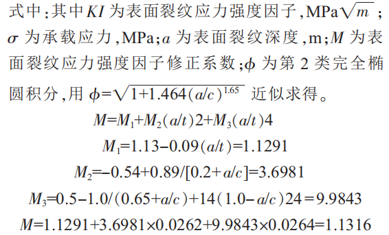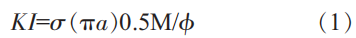 材料的裂纹强度因子KI是反应裂纹剪短应力强弱的重要物理参数。按照牛曼-瑞久(Newman-Raju)公式(1)可知表面裂纹应力强度表达为:
