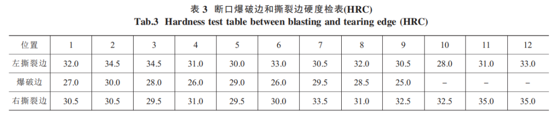 根据气瓶设计要求,其抗拉强度为 950MPa~1099MPa(换算成硬度为30.5HRC~35.5HRC)。现将存在的断口爆破边和撕裂边进行处理,分别用电火花线切割,去除45°斜边并磨平,进行表面硬度检测(间距7mm),数据见表3。分析可知,爆破边的硬度最低为25 HRC、最高30 HRC、平均27.7HRC,换算成抗拉强度为890MPa,比设计要求最小抗拉强度的保证值950MPa低了60MPa。由此可推断,渗 碳体的聚集降低了爆破区的硬度,与气瓶失效有关。