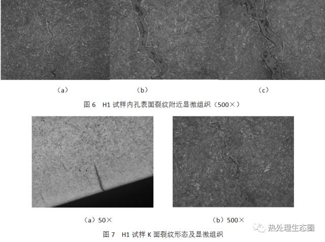 从试样磨抛后观察到的裂纹形态来说,试样H1和试样B1内孔表面和壁厚方向上裂纹尖端均呈现比较尖锐的特点,其扩展路径上则呈现出穿晶的特征,是典型的淬火裂纹。从侵蚀后的显微组织来看,两个试样裂纹附近的显微组织均为回火索氏体,未发现大块状铁素体及长条状铁素体分布,裂缝两侧未发现明显的氧化脱碳层。这说明,裂纹是在热处理过程中形成的。