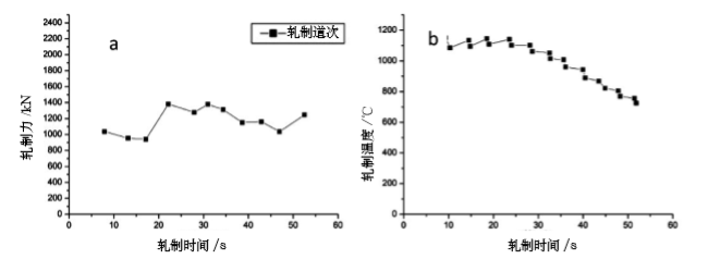 图2 904L轧制力、轧制温度与轧制道次关系(a 轧制力 b 轧制温度)