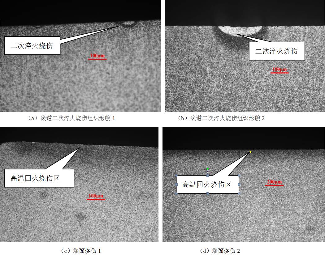 对滚动面的二次淬火烧伤条纹处制取截面试样,其组织形貌见图2a和2b,白色区域为二次淬火组织,呈现月牙型,黑色月牙型区域也为高温回火烧伤组织区。当温度超过奥氏体化温度,原来的马氏体组织被重新加热转变成奥氏体,随后快冷被淬火,形成了了一层薄、硬而脆的没有经过回火的马氏体,在白亮区边缘被暗黑色带所包围,这层暗黑色区属高温回火烧伤区。当多种应力综合,超过该材料强度极限,严重者会引起表层二次裂纹。