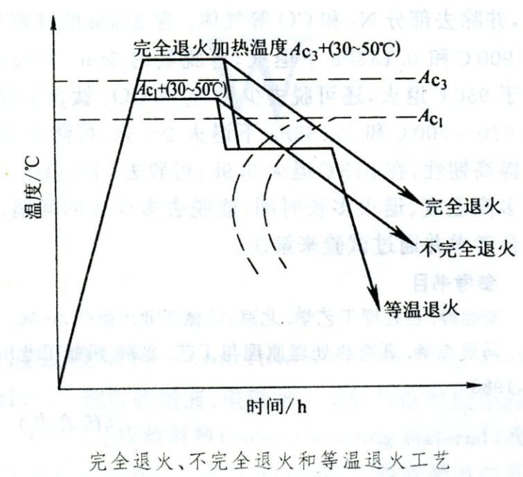 用钢材制造的许多机器零部件(如轴、曲轴、齿轮、销钉、丝杆等)和经过锻造后的毛坯要进行正火或退火处理,以消除锻坯中的粗大网状组织或魏氏组织。退火工艺有几种,对于亚共析钢中的低碳和中碳钢,常采用完全退火或不完全退火,二者只是加热温度不相同,目的一致。不完全退火适用于组织不十分粗大且要求不高的制件。也可以用等温退火取代上述两种退火工艺。图示为完全退火、不完全退火和等温退火工艺曲线与TTT曲线相互关系的示意图。等温退火是完全退火和不完全退火的特殊形式。