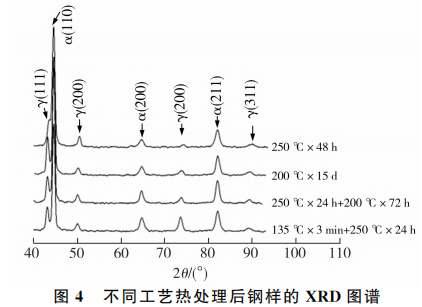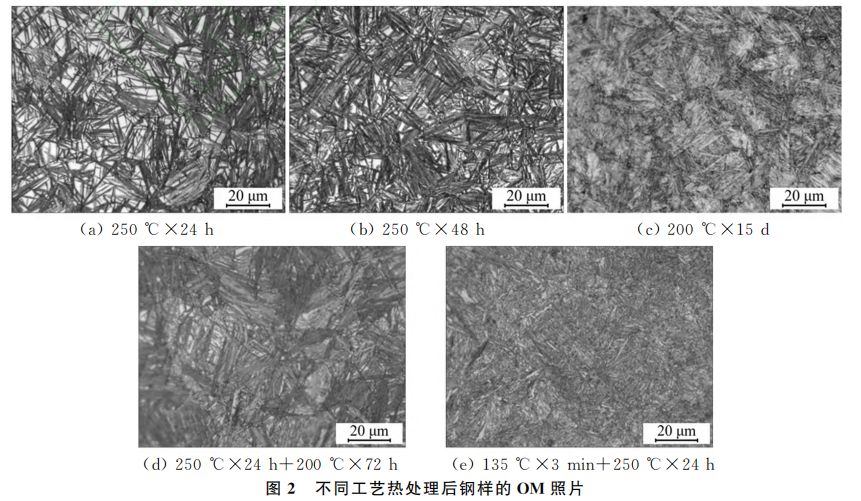 D衍射图谱,计算得到试样中残余奥氏体的体积分数列于表2中。从表2可以看出,对于一步 等温贝氏体转变工艺而言,在较低温度下等温更长时间时(200 ℃×15d),钢样中残余奥氏体体积分数最小,与250 ℃×48h条件下相比降低了约1倍;两步等温贝氏体转变工艺处理后,钢样中 残余奥氏体体积分数介于200℃×15d和250℃ ×48h工艺条件处理的钢样之间,而 QPB 工艺 处理钢样中残余奥氏体体积分数最高,这是由于在低温贝氏体转变前进行预马氏体相变(淬火), 可以增加奥氏体中位错密度,为贝氏体提供形核 质点,缩短了奥氏体向贝氏体转变的时间,但同时 会引起贝氏体生长中碰撞几率的增加,最终导致贝氏体转变量下降[12]。
