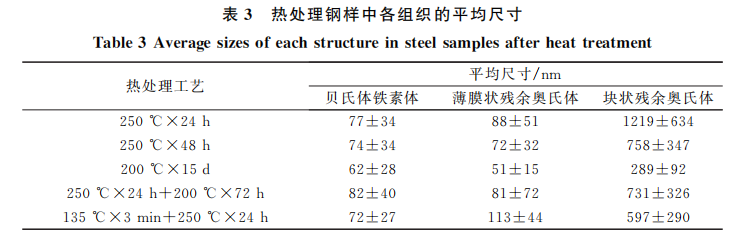 不同工艺热处理后钢样中各组织的平均尺寸 统计结果列于表3中。由表3可知,250℃×24h 条件处理的钢样中,块状残余奥氏体(或 M/A 岛)平均尺寸达到了1219nm,随着等温时间延长至48h,块状和薄膜状残余奥氏体的平均尺寸明显降低,而200 ℃×15d条件下处理的钢样中, 各组织的平均尺寸均达到最小值。与充分转变的一步贝氏体组织相比,两步等温贝氏体转变得到试验钢组织中,贝氏体铁素体和薄膜状残余奥氏 体板条宽度均有所增加,块状残余奥氏体组织平均尺寸增大。QPB工艺处理后,钢样组织中贝氏体铁素体板条宽度与250 ℃×48h条件下接近, 薄膜状残余奥氏体板条宽度明显高于其他工艺条件处理的钢样。