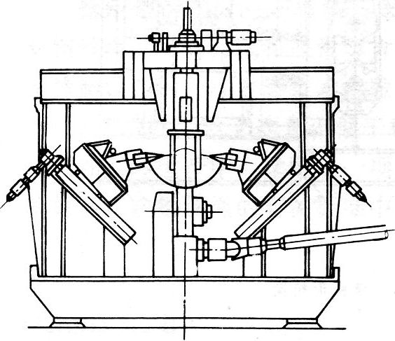 80年代初期全排辊成形发展到了鼎盛时期,它以其无可比拟的优点为壁厚与管径比(t/D)小的薄壁大口径钢管生产提供了可靠的成形技术。但它只适用于薄壁管和中等壁厚管的生产,也就是t/D在≤1%(下限)到<5%(上限)范围内。80年代后期焊管向厚壁、特殊材质和高强度方向发展,而全排辊成形机最大的缺陷是生产厚壁管时刚度不足。为了充分利用排辊成形的优点,1984年日本新日铁公司设计了一套半排辊φ406m(16in)成形机,生产管径114.3~406mm、壁厚2.1~19mm、t/D1.2%~12%的厚壁管,采用w孔型系统,如图4所示.