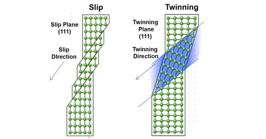 TWIP在变形过程中,产生塑性变形的因素包括位错滑移、孪生及相变,TWIP钢的塑性变形机制与层错能(SFE)密切相关。层错能是合金材料的重要物理特征,直接影响材料的力学性能、位错交滑移、相稳定性等。图9所示为面心立方晶体的滑移和孪晶变形示意图。