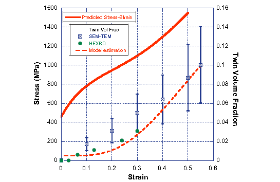 图8 TWIP钢实验室测得的和预测的孪晶体积占比的演变(右侧Y轴)和预测的应力-应变曲线(左侧Y轴)(Fe–17.5 wt.% Mn–1.4 wt.% Al–0.56 wt.% C)