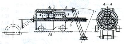 1-柱形芯棒;2-轧辊;3-轧辊架;4-支承板;5-厚壁套筒;6-大连杆;7-摇杆;8-管子