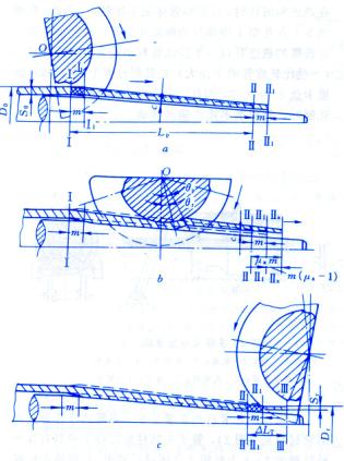 冷轧管时金属的变形和应力状态 以二辊式冷轧管机轧管为例,在轧管过程中金属的变形过程如图3所示。送料时工作锥向轧制方向移动一段距离m(送进量),相当于管料的Ⅰ-Ⅰ截面移动相同的距离到了Ⅰ1-Ⅰ1,位置,Ⅱ一Ⅱ的截面移动同一个距离m到了Ⅱ1一Ⅱ1位置(图3a)。由于在管料送进的时候,工作锥的内表面脱离了芯棒的表面,两者之间形成了一个间隙c,所以,当工作机架前移,工作锥变形时,在变形区中先是减径,然后是压下管壁(图3b),而且在变形和延伸的过程中,工作锥内表面与位于轧槽块前的芯棒之间的间隙不断增大。同时,工作锥的末端截面移动到Ⅱx一Ⅱx位置。