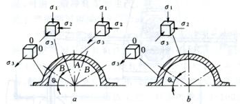 冷轧管时,金属是在不断改变着位置和形状的瞬时变形区内变形的。金属在轧辊的正压力P、芯棒的正压力N,来自轧辊的摩擦阻力T以及来自芯棒的摩擦阻力T1的作用下进行变形(图4)。若在金属与轧辊接触的变形区中取一单元体,则其径向主应力σ1、周向主应力σ2和轴向主应力σ3均为压应力,所以冷轧管时,金属变形基本应力的应力状态是三向压应力,但在辊缝处(φ角范围内)轴向承受单向拉应力,见图5。与冷拔管时的二向压一向拉的应力状态相比,这种应力状态更有利于金属塑性的发挥。