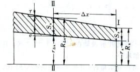 瞬时变形区变形量的确定 在一般纵轧过程中,变形区的几何尺寸是不变的。所以坯料上的任一个截面都可以一直从变形区的入口移动到出口。变形区进口截面和出口截面的高度差、就是坯料上任一截面连续通过变形区时的压下量,而且是稳定不变的。但在冷轧管时,进入变形区的和离开变形区的管体截面的尺寸是不断变化的,而且瞬时变形区进口截面和出口截面的高度差也不等于工作锥上进入瞬时变形区的截面在一个轧制行程中的压下量。因此,冷轧管时,工作锥上的任一截面在一个轧制行程中连续通过不断变化着的瞬时变形区时所达到的变形量是不相同的,而且确定它的大小也是比较复杂的。在实际计算中,通常是根据各瞬时变形区出口截面的尺寸,确定该截面变形开始时在工作锥上的位置和尺寸,再计算其变形量。这个变形量称为瞬时变形区变形量。瞬时变形区变形量的计算一般以下述原则为基础:设某瞬时变形区的出口截面为Ⅰ-Ⅰ(图6),该截面在通过瞬时变形区时所经受的压下量等于它与另一截面Ⅱ一Ⅱ的高度差,而这两个截面之间所包括的金属体积等于送进的金属体积。图中Rx 、rx和Sx分别为瞬时变形区出口截面的外半径、内半径和壁厚;RΔx 、rΔx和SΔx分别为该截面变形前的外半径、内半径和壁厚。