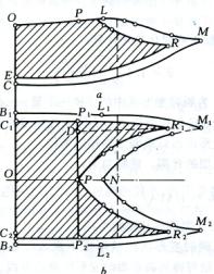 图9为借助于计算接触角θ得到的正行程轧制时瞬时变形区接触表面积的垂直投影和水平投影。区域OPLMC为总接触表面积的垂直投影;OPRE=Fys为减壁区接触表面积的垂直投影;B1L1M1NM2L2B2=Fdx用为总接触表面积的水平投影;C1R1PR2C2=Fxs减壁区接触表面积的水平投影。