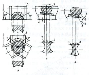 a-二辊冷轧管机的变形区;b-多辊式冷轧管机变形区;c-正行程的接触面积;d-返行程的接触面积