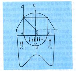 轧制过程中的滑移及轴向力 在冷轧管过程中,金属与轧槽表面之间存在着相对滑动即滑移。变形区由前滑区和后滑区构成。轧制过程中,在前滑区作用在金属上的摩擦力(图10中Tx2)的方向和机架移动的方向相反;在后滑区ABc作用在金属上的摩擦力(图10中的Tx1)的方向和机架移动的方向相同。