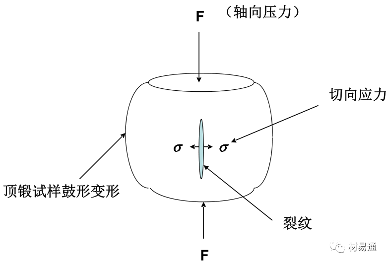 ①试样顶锻时易趋向变为鼓形,这是由于试样两端面受摩擦力影响而限制了试样横向变形所致。
