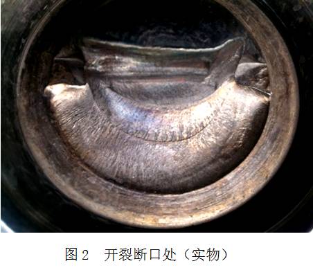 半轴摆辗模具中心断裂掉下的半个蘑菇头,蘑菇头的断口对应于半轴摆辗模具断口,图示上部分的第一条弧线为一次裂纹终止线,弧线上的多源台阶条纹更为清晰,下部分的第二条弧线更为突出,整体的断口立体感更强,对分析说明更具说服力(见图3)。