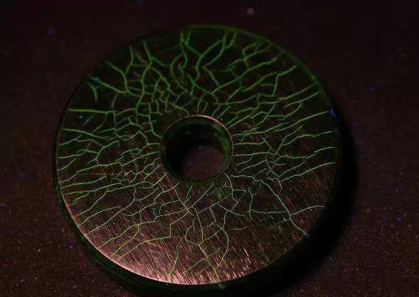 肉眼无法察觉的微裂纹,经荧光渗透检,在紫外线灯的照射下,黄绿色荧光格外醒目,如下图所示: