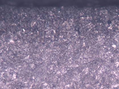 样块左侧的表层相距不足10mm长度范围内,断续分布数十条表面微裂纹,裂纹沿表层圆弧状凹坑底部开裂。根据金相组织检查初步推断,表层的凹坑是工件表面镀锌过程中,酸洗时间过长留下的腐蚀坑。表面微裂纹的深度在0.10~0.20mm。表层密集分布的黑色点状组织是表面镀锌层,白亮色块状组织为脱碳层中的铁素体组织。经测量镀锌层为0.04mm,脱碳层为0.10mm,其中全脱碳层为0.04mm,半脱碳层为0.06mm(见图7)。样块右侧的表层灰黑色镀锌层更加明显。右侧的脱碳层深度与左侧的脱碳层相近,心部组织仍然是保持马氏体位向的索氏体组织(见图8)。