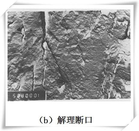 实际工程结构中,比如大型转动件、高压容器、船舶、桥梁等,有时在工作应力远低于屈服应力下发生了低应力的脆断。大量失效案例分析后表明,这种破坏是与零部件本身存在裂纹及其裂纹的疲劳扩展有密切关系,典型的断口形貌如图2-18、图2-19 所示。