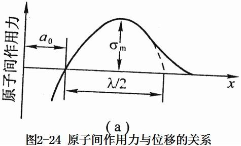 设想完整的晶体材料被解理面分开成两半晶体,其解理面的晶面间距为a0, 沿拉力方向发生相对位移x, 当位移很大时,位移和作用力的关系并不是线性关系。而原子间的相互作用力最初是随x的增大而增大,但达到一峰值σm后就逐渐下降,见图2-24。