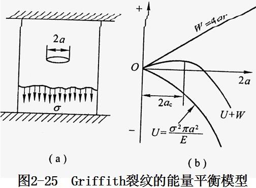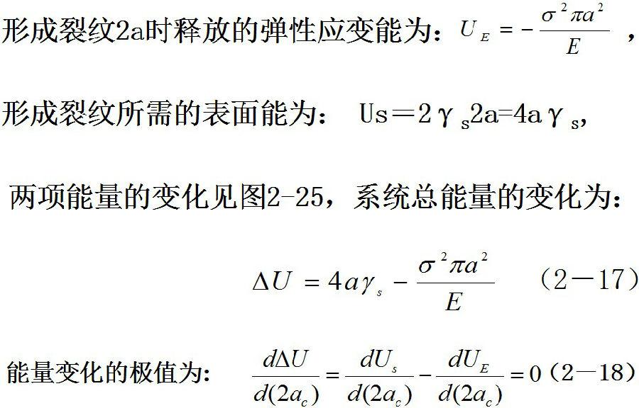 他假定有一块单位厚度的薄板,两端在远处被固定并作用均匀拉伸应力σ。如果板内有一个长为2a的穿透裂纹,裂纹扩展的驱动力来自系统内部存储的弹性能释放, 如图2-25所示。若裂纹发生扩展,则裂纹面积会增加,增加单位面积所需的能量叫表面能 γs。