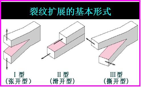 根据应力作用方式的不同(图2-28),材料的应力强度因子值共分张开型KI、滑开型KII、撕开型KIII 三种类型。