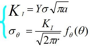 其中, KI的量纲是N/m3/2 ;Y是几何形状系数,与试样尺寸有关,σθ 、 f(θ)分别是裂纹尖端附近的环向应力和角分布函数。