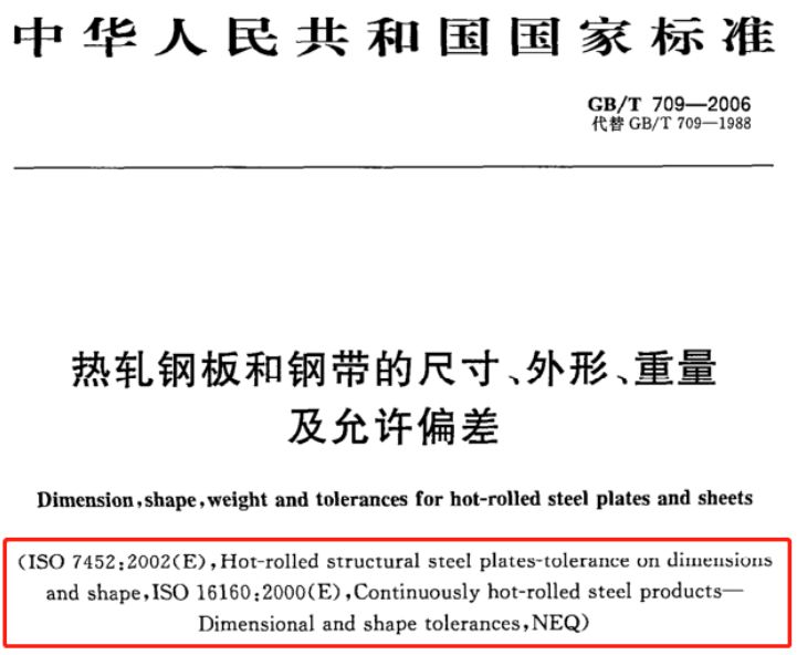 (括弧中意思,非等效采用NEQ了:ISO7452-2002(E)热轧结构钢板尺寸、外形偏差标准,ISO16160-2000(E)热连钢带和钢产品的尺寸、外形允许偏差)