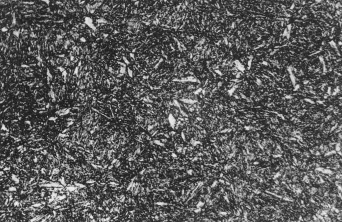 回火屈氏体经中温回火产物,其特征是:马氏体针状形态将逐步消失,但仍隐约可见(含铬合金钢,其合金铁素体的再结晶温度较高,故仍保持着针状形态),析出的碳化物细小,在光镜下难以分辨清楚,只有电镜下才可见到碳化物颗粒,他极易受侵蚀而使组织变黑。如果回火温度偏上限或保留时间稍长,则使针叶呈白色;此时碳化物偏聚于针叶边缘,这时钢的硬度稍低,且强度下降。