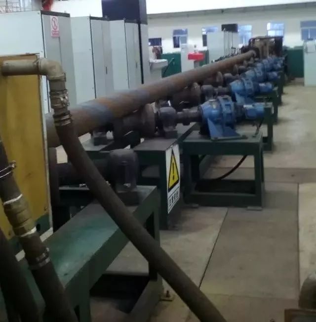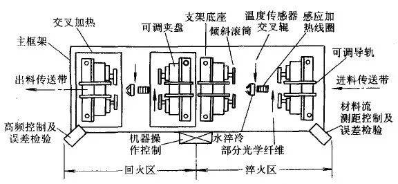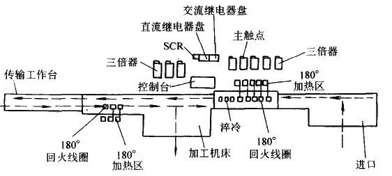 注:管材从右侧进入,加热奥氏体化后经过淬冷、输出、回火。随后被送到加工机床冷却。