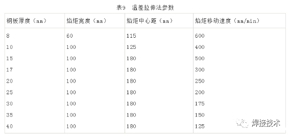 两侧金属受热膨胀对温度较低的区域进行拉伸,所以就可消除部分焊接残余应力,据测定,消除的效果可达50%~70%。温差拉伸法的参数,见表9。
