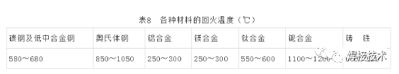 各种材料的回火温度,见表8。含钒低合金钢在600~620℃加回火后,塑性、韧性下降(回火脆性),回火温度宜选550~560℃。