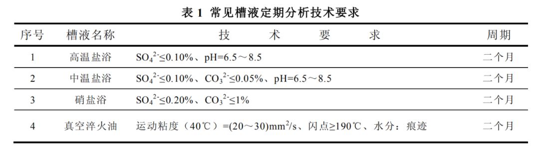 优质的材料是热处理质量控制的最初保证,如果钢材本身存在着各种缺陷和问题,就可能在热处理时被扩大或者引发热处理缺陷和问题,从而影响热处理质量。热处理工艺材料是指在热处理生产过程中使用,对零件热处理质量影响很大的材料,它包括热处理用盐、淬火介质、保护气体等。如表1所示为常见槽液定期分析技术要求。