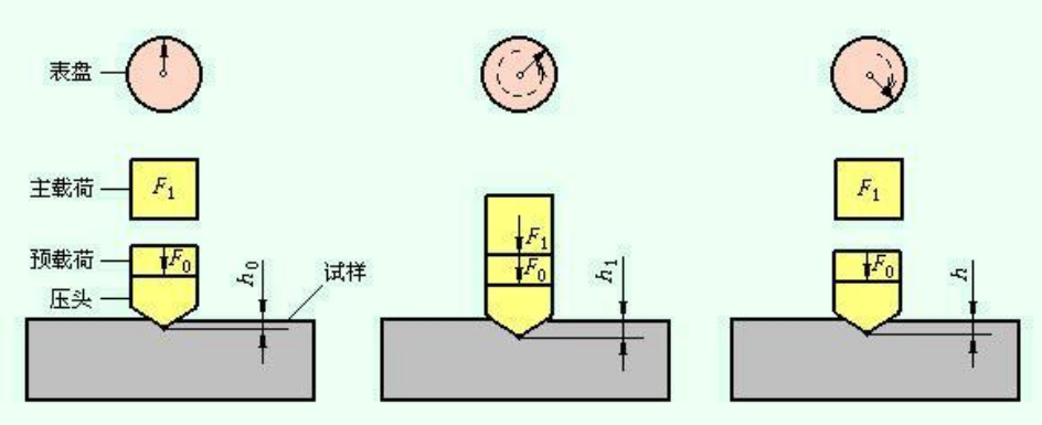 In the Rockwell hardness test, the indenter is a standard diamond cone (金刚石圆锥) or hardened steel ball. The hardness is determined by measuring the depth of penetration of an indenter under a large load compared to the penetration made by a preload.