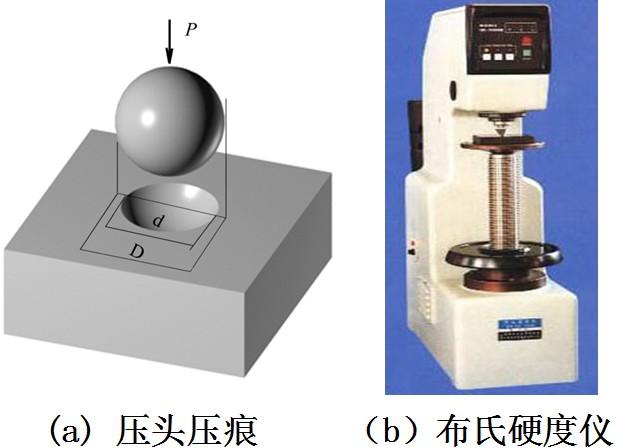 布氏硬度是用一定载荷P,将淬火钢球压头压入被测材料表面,保持一定时间后卸载,根据压入的直径d的压痕面积A(图2-12)来获得。计算式为: