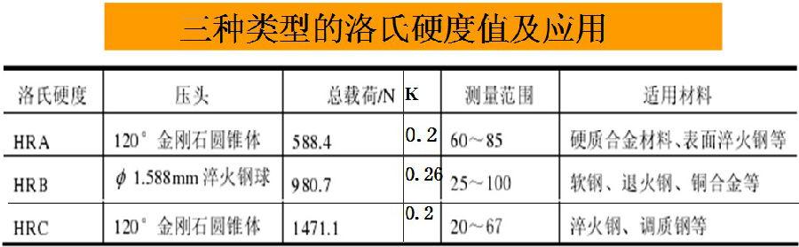 根据压头和载荷的大小,洛氏硬度分为HRC、HRB 、 HRA三种类型 (见下表)。