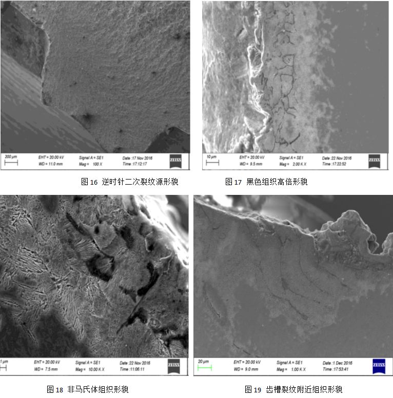 (7)断口扫描电镜微观检验 用扫描电镜对断口进行微观分析,可见齿轮轴开裂于花键根部淬硬层表面,微观形貌主要为脆性沿晶开裂(见图10~图12)。并分别向顺时针方向以及逆时针方向疲劳扩展,微观形貌为脆性的沿晶+解理开裂,扩展过程中在部分其他齿根处也不断萌生二次裂纹源(见图13~图16)。