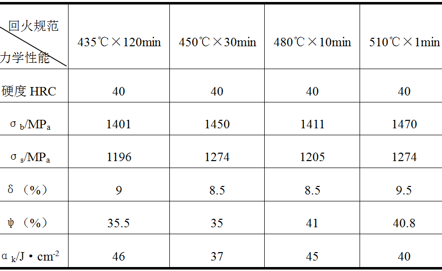 回火规范 力学性能 | σb /MPa | σs/MPa | δ(%) | ψ(%) | αk/J·cm-2 | 回火后硬度HRC |