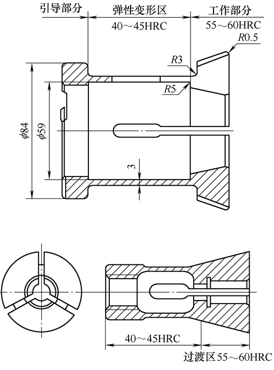 手用丝锥一般用9SiCr、GCr15钢制造,少数厂家用T12A,刃部硬度要求61~64HRC,方尾柄部要求40~50HRC。由于方尾只有几毫米长,淬火加热时全部入液,刃柄一起硬化。淬火后装入合适的夹具中,方尾部分入600℃的硝盐中快速加热40~80S(根据具体规格而定),硬度正好落在工艺要求范围内。最后施以180~200℃×2h回火。某自动车上使用的弹簧夹头如图3所示,材质为60Si2Mn,此材料硬度在40~45HRC时有很好的弹性,硬度>55HRC时有良好的耐磨性。因此,将夹头柄部的硬度定为40~45HRC,夹头硬度定为55~60HRC是比较切合实际的。通过淬火+低温回火,可以保证工件整体硬度≥56HRC,然后再在硝盐中高温局部快速回火。快速回火时要注意对过渡区的控制,通过专用夹具,保证夹头过渡区下部10mm浸在硝盐中,回火时间同硬度的关系见表5。
