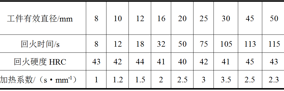 例如,45钢在860℃温度快速回火时,选Ks=30s、As=0.3、D=10mm,则T=30+0.3×10=33(s),即回火时间为33s,回火后硬度为52HRC,若用传统的200℃×(1~1.5)h回火,回火后的硬度也是52HRC。