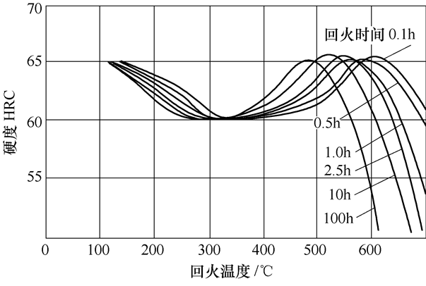 上述快速回火工艺,满足了同一工件不同部位不同硬度要求的技术规范,在现实生产中很有经济意义。高速钢回火应达到最佳的二次碳化物析出,残留奥氏体充分分解和彻底消除残余应力三大目的。通过高速钢(HSS)的回火二次硬化峰值温度在550℃左右,研究发现,二次硬化峰的位置与回火保温时间有一定的关系。图4为回火保温时间的延长,硬化峰的位置向低温方向移动。反之,回火温度的升高,可以缩短保温时间,正是基于这种原因,高温短时节能回火才得以实现。