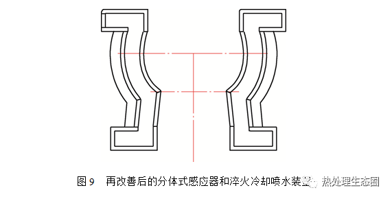 针对装夹和卸件效率低的问题,我们分析主要是新设计的定位和装夹装置不够合理,导致人工操作动作比较多,花费时间长,为此我们决定引入立式机床来取代原定位和装夹装置,这样减少了原固定螺母的时间和工件放入下置的装夹机构所需移入感应器内的时间,为此相应的图5所示的分体式感应器和淬火冷却喷水装置中A-A视图变为图9所示状态。