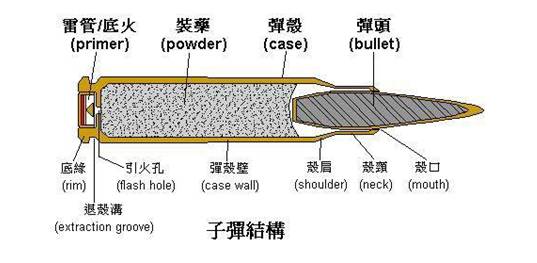 子弹由弹壳、底火、发射药、弹头四部分组成。发射时由撞针撞击底火,使发射药燃烧,产生气体将弹头推出。