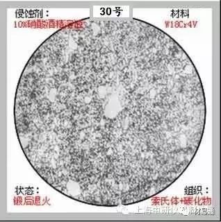30、S+碳化物。基体为S,S呈暗黄色,白色块状为共晶碳化物,白色细小颗粒为二次碳化物。