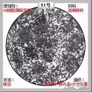 51、P+片状石墨+磷共晶. 层片状基体为P,由于深浸蚀而成黑色;灰黑色为片状石墨,白色棱角状为磷共晶。