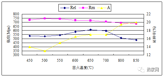 抗拉强度整体呈现下降的趋势,但下降缓慢,回火温度每升高50℃,抗拉强度只下降5-10Mpa,抗回火性能良好,这是TMCP+T工艺的一个显著特点。延伸率在500℃后呈现出逐步上升的趋势,650℃时达到17%。