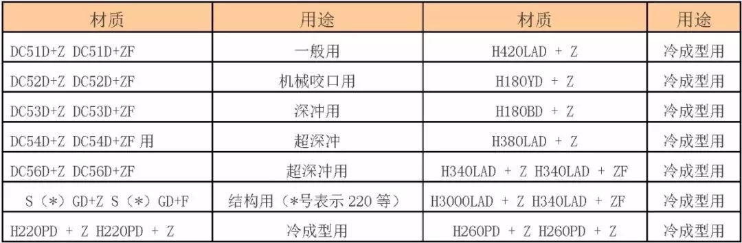 一、普通冷轧板材简介 是由热轧薄板通过冷压力加工而得到的产品。由于经过多道次的冷轧,其表面质量优于热轧薄板,经过热处理后,可得到良好的力学性能。 1、普通冷轧板材的用途分类 根据生产企业的不同需求,通常将冷轧板分为: 一般用冷轧板、冲压级冷轧板、深冲、特深冲及超深冲级冷轧板, 一般以卷材和平板交货,厚度以毫米表示, 宽度一般为:1000mm和1250mm,长度一般为2000mm和2500mm。 2、普通冷轧板材的牌号 常用牌号为: Q195、Q215、Q235、08AL、SPCC、SPCD、SPCE、SPCEN、ST12、ST13、ST14、ST15、ST16、DC01、DC03、DC04、DC05、DC06等; ST12: 表示为最普通的钢号,与Q195、SPCC、DC01牌号材质基本相同; ST13/14: 表示为冲压级的钢号,与08AL、SPCD、DC03/04牌号材质基本相同; ST15/16: 表示为冲压级的钢号,与08AL、SPCE、SPCEN、DC05/06牌号材质基本相同。 3、普通冷轧板材的牌号尺寸表示方法 例如鞍钢产ST12,1*1250*2500/C,表示为:牌号ST12普通冷板,厚度为1mm,宽度为1250mm,长度为2500mm或C卷材。 外观为白铁皮精包装,机械性能为最普通的,最基础的钢号,只能用于折弯成型,不能用于冲压。使用于机械咬口用,例如冰箱的外壳,车辆油箱等。 ST13以上产品,用在需要深冲的行业,如汽车制造,柴油机的油箱等,具体要用哪一种,看其拉深的要求而定。 ST12与SPCC的差别:其两种产品的机械性能相差无几,只是退货方式不同,ST12材质的产品拉伸性能相对比SPCC要强。 日本JIS标准材质含义 SPCC---S表示为钢(Steel),P表示为板(Plate),C表示冷(Cold),C表示商业(Commercial),为日本JIS标准。 如需保证抗拉强度,在牌号末尾加T,为:SPCCT。 SPCD---表示冲压用冷轧碳素钢薄板及钢带,相当于中国08AL(13237)优质碳素结构钢。 SPCE---表示深冲用冷轧碳素钢薄板及钢带,相当于中国08AL(5213)深冲钢。 如需保证非时效性,在牌号末尾加N为SPCEN。 冷轧碳素钢薄板及钢带调质代号:退火状态为A,标准调质为S,1/8硬度为8,1/4硬度为4,1/2硬度为2,全硬度为1.表面加工代号:无光泽精轧为D,光亮精轧为B。 例如SPCC-SD表示标准调质、无光泽精轧的一般用冷轧碳素薄板。 再如SPCCT-SB表示标准调质、光亮加工,要求保证机械性能的冷轧碳素薄板。 再如SPCC-1D表示硬的无光泽精轧冷轧碳素钢薄板。 机械结构用钢牌号的表示方法为:S+含碳量+字母代号(C、CK),其中含碳量用中间值*100表示,字母C表示碳,字母K表示渗碳用钢。如碳结卷板S20C其含碳量为0.18-0.23%。 中国GB标准材质含义 从牌号上基本上分为: Q195、Q215、Q235、Q255、Q275等。 Q表示钢材屈服点“屈”字的汉语拼音首位字母,195、215等表示屈服点的数值, 从化学成分上分,低碳钢牌号: Q195、Q215、Q235、Q255、Q275牌号越大,含碳量、含锰量越高,其塑性就越稳定。 二、热镀锌钢板简介(银白色) 是以热轧钢带或冷轧钢带为基板,经过连续热浸镀锌工艺而生产出来的,可以防止薄钢板和钢带表面腐蚀生锈。 经横切以矩形平板供货的为热镀锌板;经卷取以卷状供货的为热镀锌卷。 由于使用的基板不同,因此热镀锌钢板可分为热轧镀锌板卷和冷轧热镀锌板卷,它们主要用于建筑、家电、汽车、容器、交通及家业等领域。特别是钢结构建筑、汽车制造、钢板窗制造等行业。 1、热镀锌钢板的特点 耐腐蚀强、表面质量好、利于深加工、经济实用等。 2、热镀锌钢板的分类与符号 按加工性能分为:普通用途(PT)、机械咬合(JY)、深冲(SC)、超深冲时效(CS)、结构(JG); 按锌层重量分为:纯锌表面分为:100/100(锌层重量小于100g/m2)、120/120、200/200、275/275、350/350、450/450、600/600; 锌铁合金表面分为:90/90 (锌铁合金层重量小于90g/m2)、100/100、120/120、180/180; 按表面结构分为:正常锌花Z、小锌花X、光整锌花GZ、锌铁合金XT; 按表面质量分为:I组(I)、Ⅱ组(Ⅱ); 按尺寸精度分为:高级精度A、普通精度B; 按表面处理分为:铬酸钝化L、涂油Y、铬酸钝化加涂油LY。 三、电镀锌钢板简介 电镀锌产品是经冷连轧机组轧制再经过CAPL机组退火后,进入电镀锌机组,通过表面清洗,在电场的作用下,锌从锌盐的水溶液中连续沉积到预先准备好的钢带表面上得到的表面镀锌层的过程。 连续电镀锌冷轧钢板和钢带适用于汽车、电子、家电等行业。交货方式以钢卷交货为主,也可通过横剪或纵剪得到所需要的钢板和钢带。 1、电镀锌钢板的不同用途 可进行磷化、钝化、涂油及耐指纹、合金化等处理后所得的产品,其有关机械性能参照相对应的基板。 2、电镀锌钢板相关标准(以某钢企为例) 【用途和牌号】 【产品的种类及代号】 【产品牌号及标准】 【表面处理分类】 【表面处理种类及特点】 【镀锌层重量】