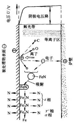 等离子在阴极位降区被加速 轰击工件表面,产生一些列反应。首先,离子轰击动能转化为热能加热工件。其次,离子轰击打出电子,产生二次电子发射。最重要的是由于阴极溅射作用, 工件表面的碳、氨、氧、铁等原子被轰击出来, 而铁原子与阴极附近的活性氮原子(或氮离子及电子)结合形成FeN。这些化合物因背散射效应又沉积在阴极表面, 在离子轰击和热激活作用下, 依次分解:Fe→FeN→Fe2N→Fe3N→Fe4N, 并同时产生活性氮原子[N], 该活性氮原子大部分渗入工件内, 一部分返回等离子区。