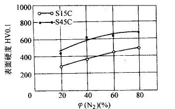▲图10 氮氢混合比对离子渗氮层表面硬度的影响